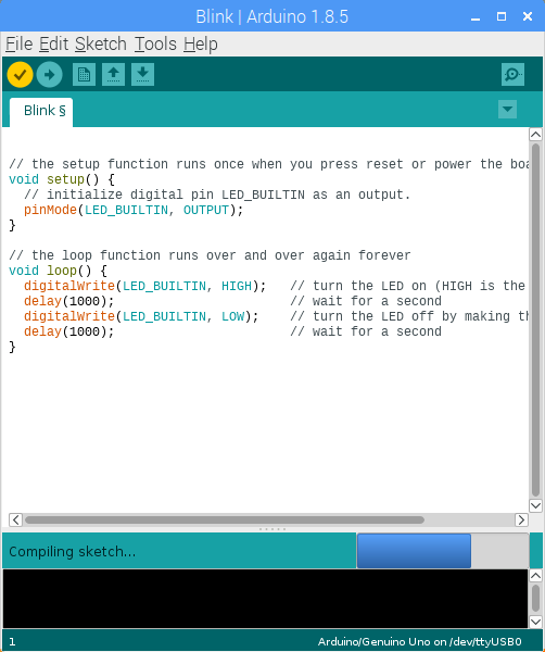 Once you've added some of your own code, click on the tick in the circle on the top left of the IDE. This will compile your program. Some other text-based languages, like Python, are interpreted languages. This means that your code is run directly by your computer. The type of C used by Arduino is a compiled language and so the source code that you write must be compiled first to create an executable file.