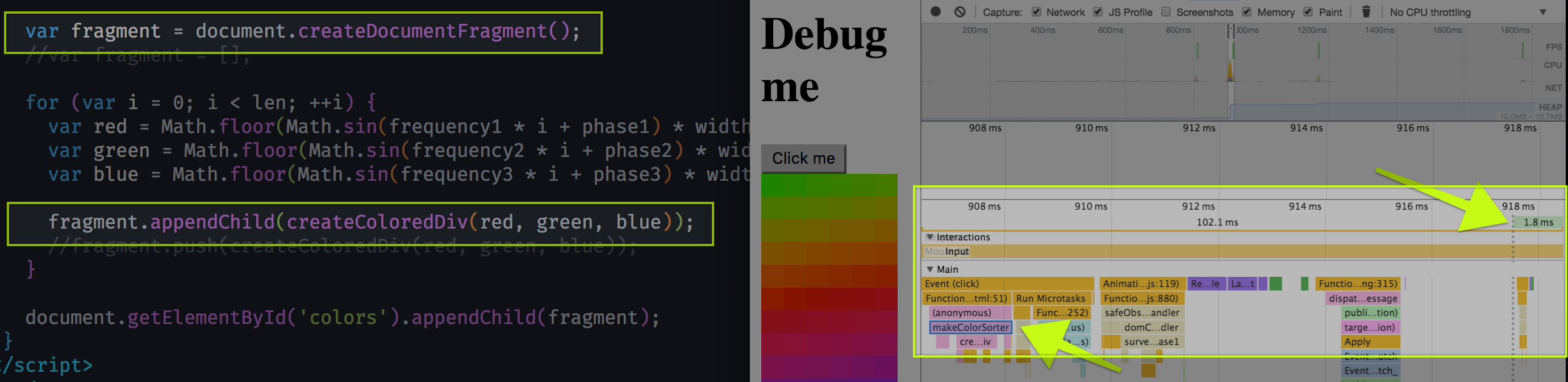 | <a href="https://www.smashingmagazine.com/2012/06/javascript-profiling-chrome-developer-tools/">Code example and how to optimize this here</a> | |