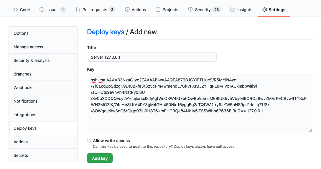 cat ~/.ssh/id_rsa.pubCopy nội dung của public key và tạo deploy keys cho dự án bằng cách truy cập repo dự án, nhấn Settings, chọn Deploy Keys ở sidebar, sau đó nhấn nút Add Deploy Key.