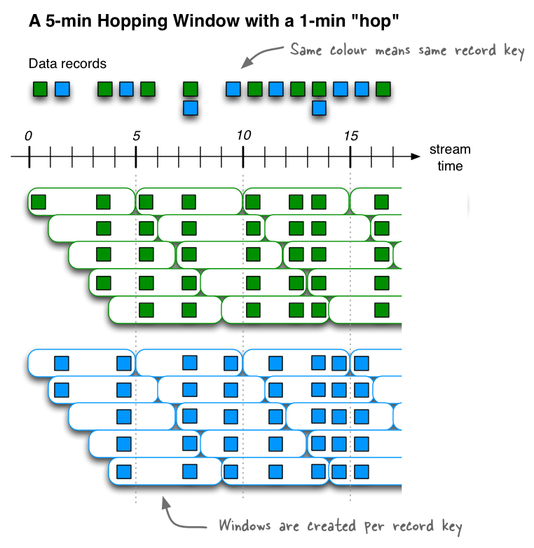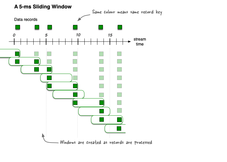 - Sliding time windows - Fixed-size, overlapping windows that work on differences between record timestamps