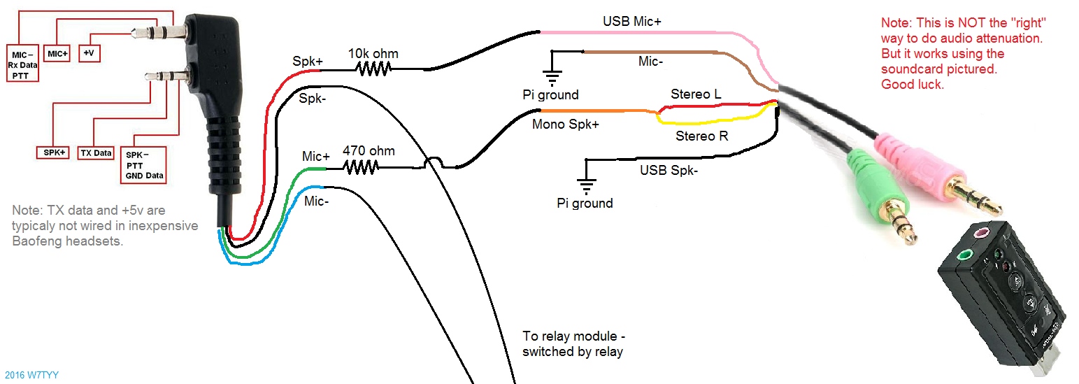 You may know that the Baofeng/Kenwood pinout provides for PTT, by grounding the Mic- to the Spkr-. This can become very tricky, because when you plug your radio directly into other circuitry, such as a USB sound card, there is often enough conductivity between the two "grounds" to trigger the PTT (all the time). So, we'll need a dedicated relay to fully isolate and manage the Spkr-/Mic- connection.