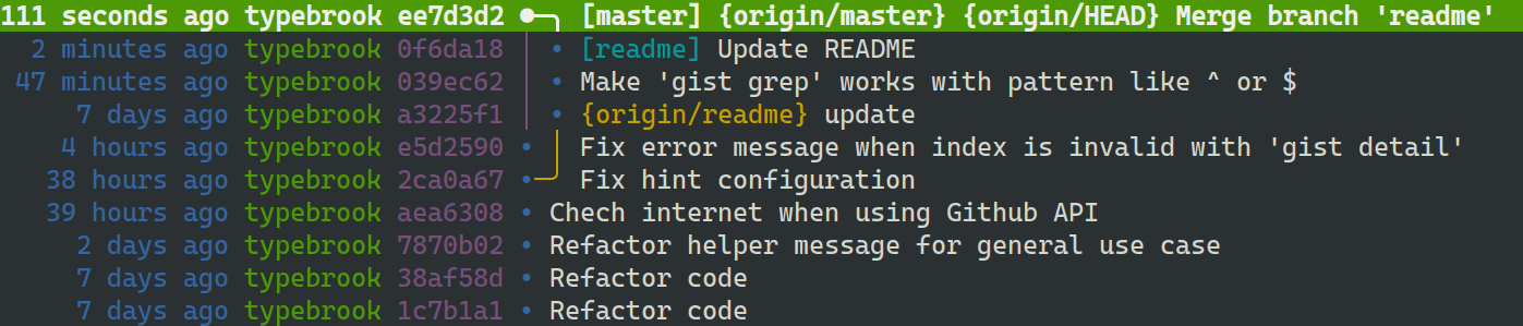 • outdated Your local HEAD is differs from the last fetched gists, do gist fetch to refresh index file and pull if needed