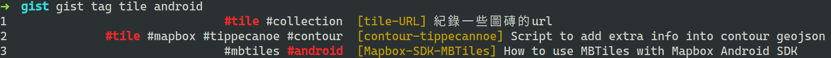 Run gist to read index file (default to ~/gist/index) and list your gists with the following format: