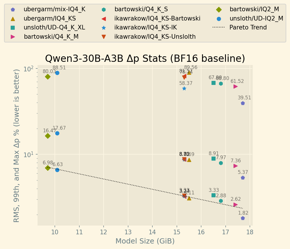 For example, for each token in a given input sequence, the unquantized model computes a probability distribution over the vocabulary (e.g., "the" has 10% chance, "cat" has 5%, etc.). The quantized model (e.g., IQ4_K or Q2_K_L) computes a similar distribution, but due to precision loss, the probabilities may shift. Δp is the absolute or relative difference between these two distributions for each token.