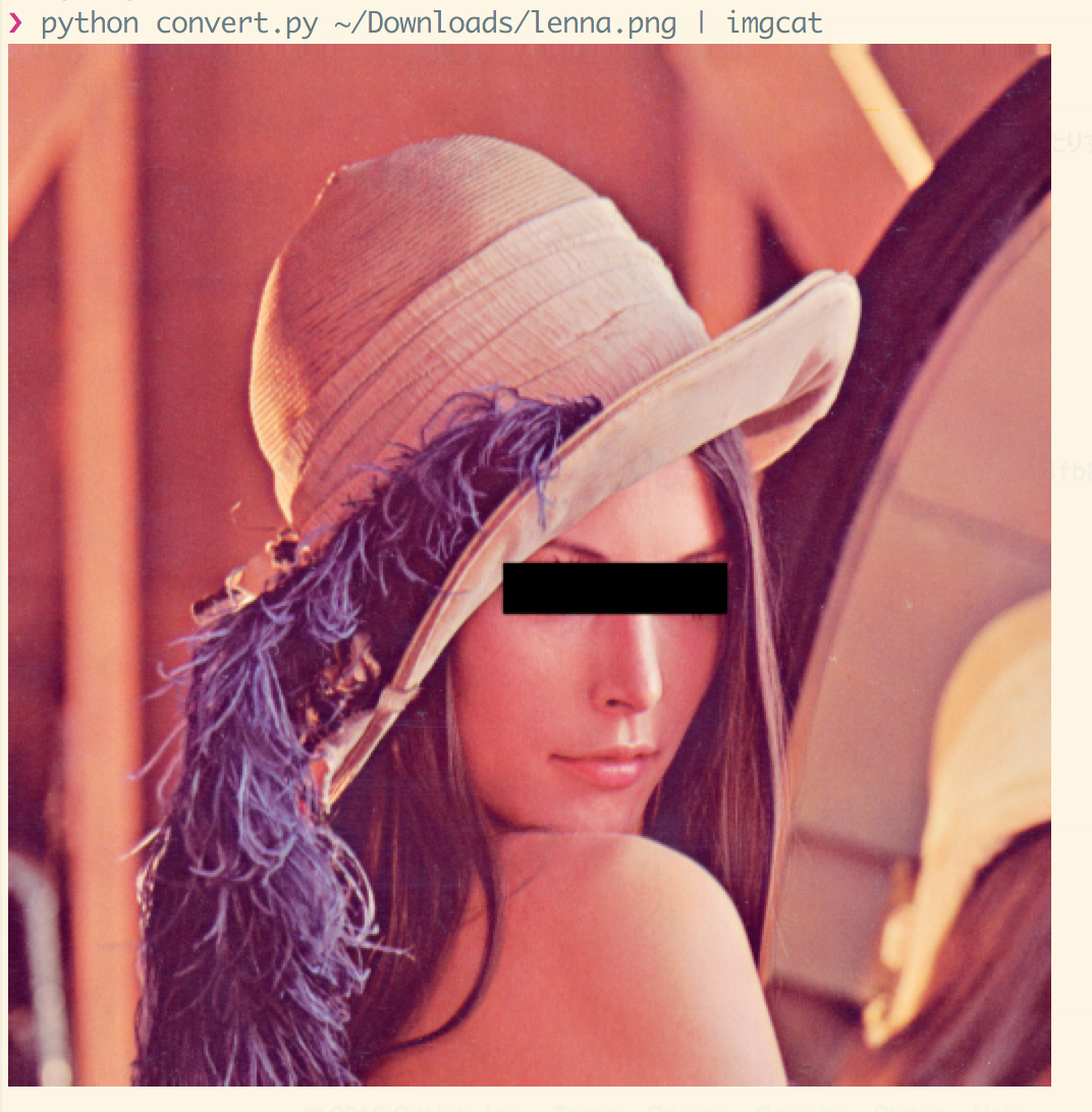 python convert.py lenna.png | imgcat当然ファイルを保存したいときには、標準出力にファイル名を指定するとよい。もしくはiTerm内で右クリックしてもいい。