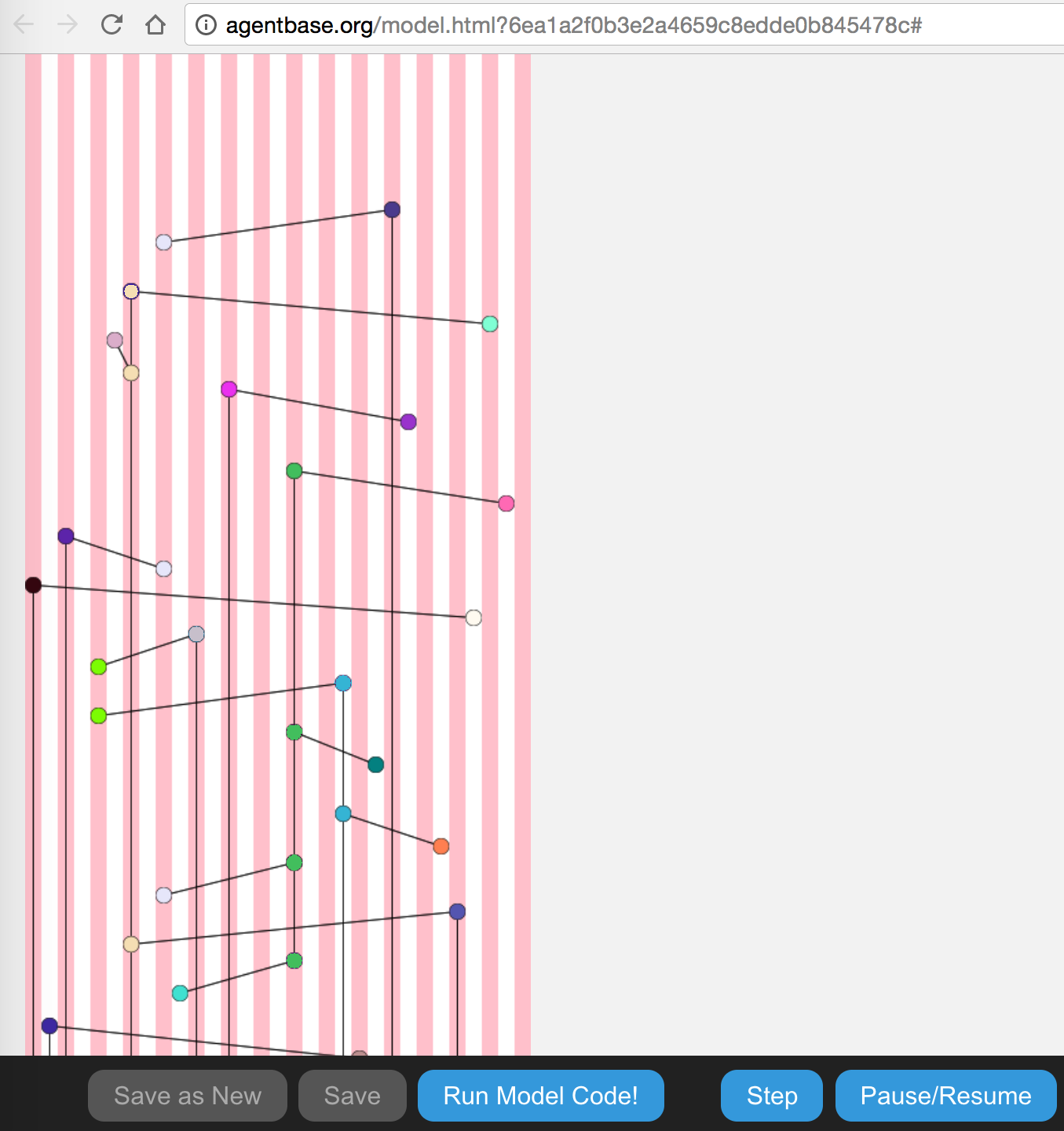 Each column on the x axis (pink and white columns) represents one agent, and to show time, an agent appears as a new dot for each transaction they make or receive.
