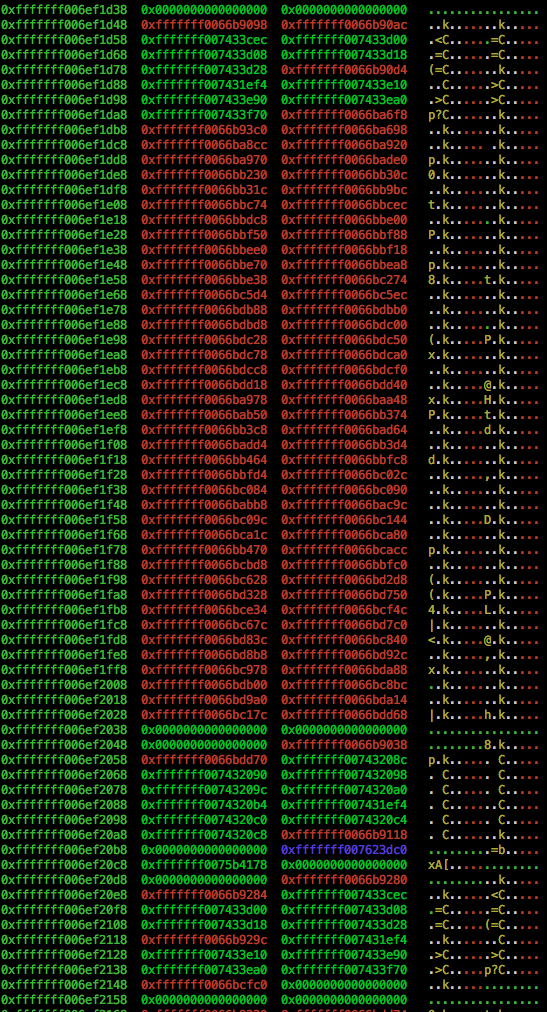 first 4 values being 0xfffffff0066b9098 0xfffffff0066b90ac 0xfffffff007433cec 0xfffffff007433d00