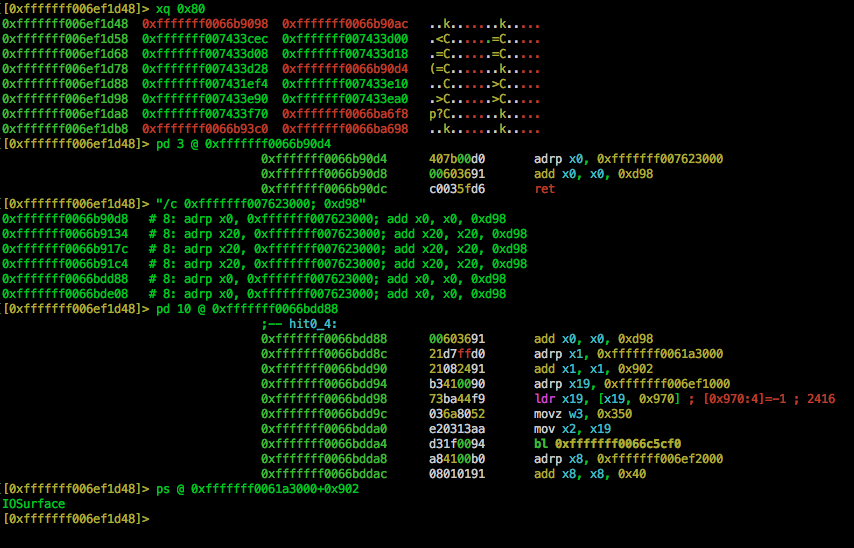 also radare2 nicely shows pointers from the kext in red and those from the kernel in green