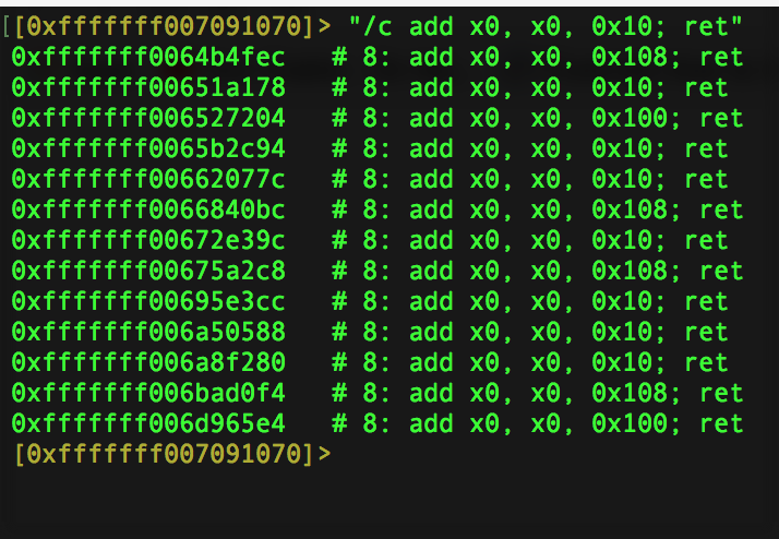 "/c add x0, x0, 0x10; ret"to search for the ROP gadget. You should get an output like this: - Take note of the second address (example it's