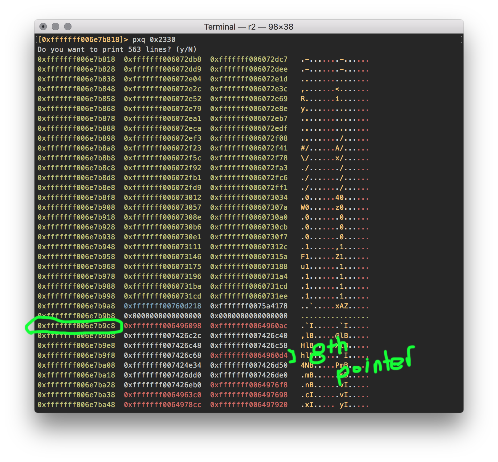 pxq 0x2330 - The first red address is the start of the vtable. The offset we are looking for is circled in green. the 8th pointer is used to check the validity