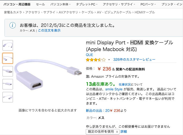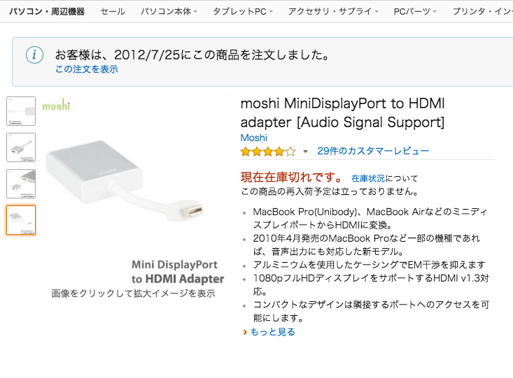 Mac などに搭載されている Mini DisplayPort を HDMI に変換するケーブルの購入履歴とレポートです。