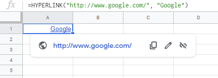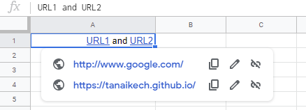 Recently, it seems that the specification of Google Spreadsheet was updated. Before this, when a cell has only one hyperlink. In this case, the hyperlink was given to a cell using =HYPERLINK("http://www.google.com/", "Google") as following figure.