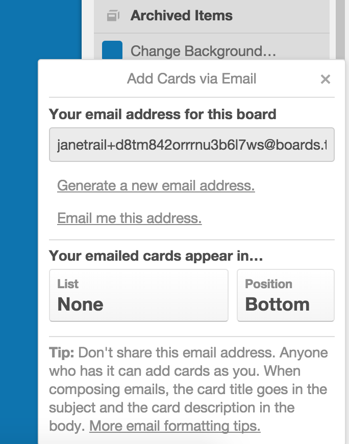 - Labels: In the subject, add #labelname, #labelcolor, or #labelnumber (Note: If your label consists of two or more words, in the subject line either join the words or use underscores between the words. For example, if your label is named "To Do" in the subject line of your email either enter #ToDo or #To_Do for the label to render properly on your card.)