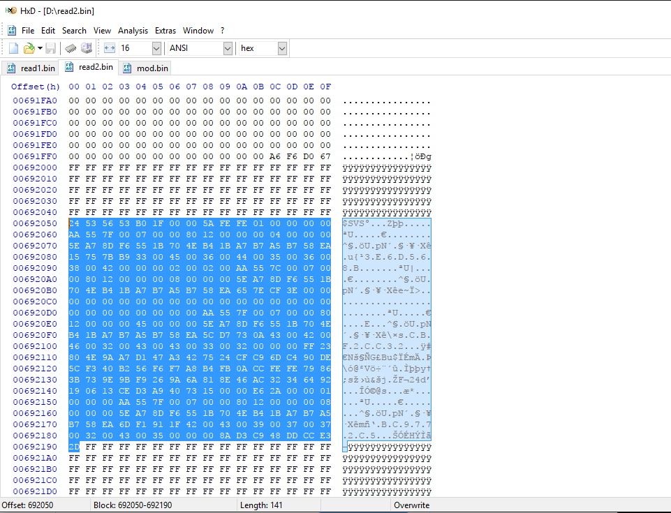 Now, with the files on another computer, I opened one of the files up in HxD, and searched for the ASCII string "$SVS" without quotes. This string denotes the blocks of hex values with the firmware password. To get rid of these blocks, we just need to fill in the hex values with "FF" without quotes. You'll want to do this to each block starting with "$SVS" in the file.