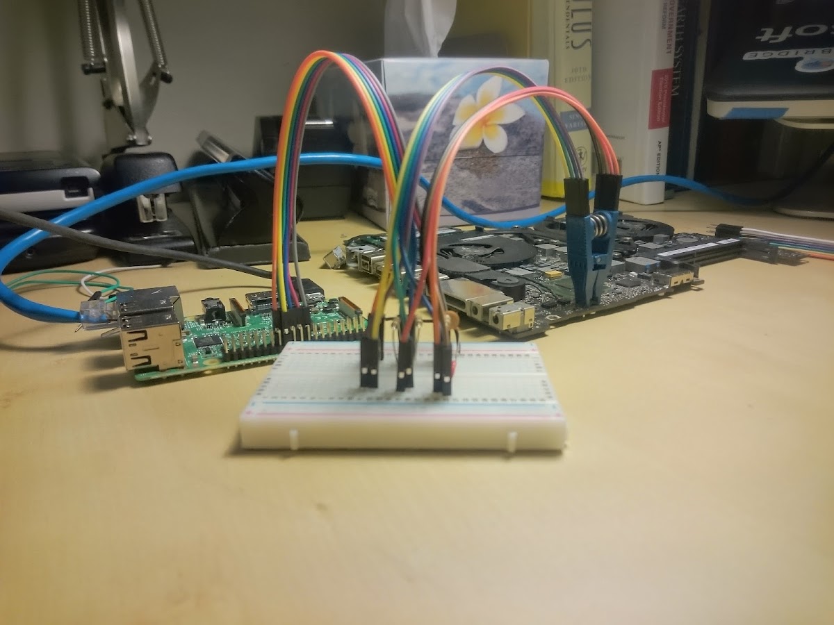$ flashrom -w mod.bin -V -p linux_spi:dev=/dev/spidev0.0 -c "N25Q064..3E"Once the process completes, you can turn off the Raspberry Pi and put the MacBook back together. If you've done everything correctly, the MacBook should just power right up.