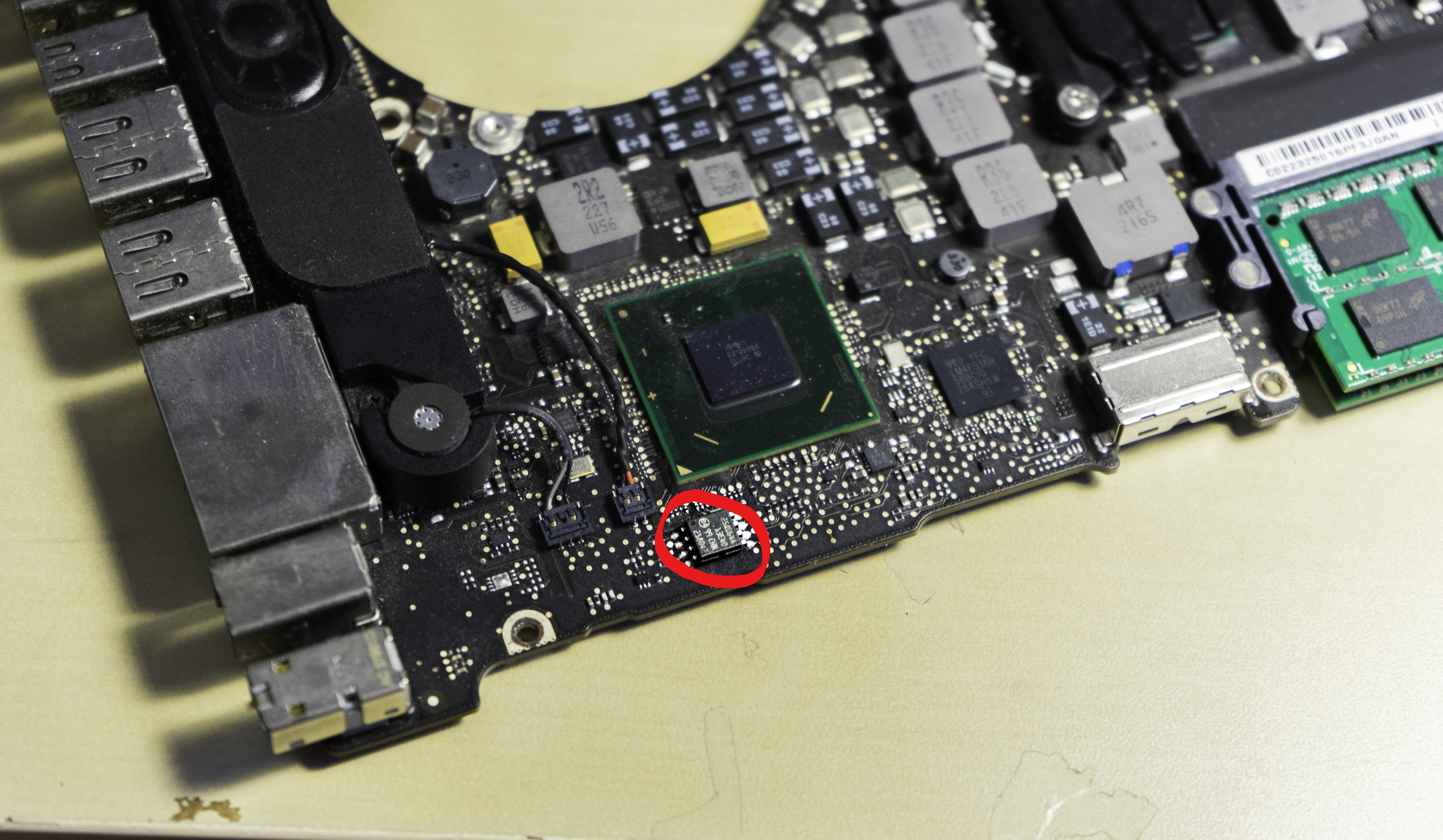 First, we'll need to verify that we can interface with the EFI flash chip at all. To get to the chip, you'll need to disassemble your MacBook to the point where you can see the top side of the logic board and identify the chip. On the A1286, the chip is located near the SD card reader and speaker. The chip will be fairly large and have eight pins.