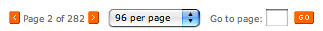 Veer does something interesting as well: simple (but frustratingly tiny) previous and next arrow buttons for browsing pages set around the current and total pages number; a drop-down for how many results per page you want and a text field to jump directly to any page in the set. The downside of a drop-down is that it has different looks in different browsers, giving a bit of an inconsistent and cluttered feel to the overall pagination area. It also lacks a consistent baseline thanks to the form controls and the buttons being oddly designed (the text labels in the image buttons does not align to the text outside of them). This simple section has five different baselines all at once.