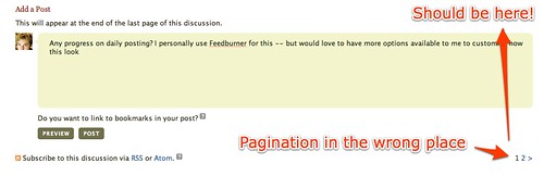 Upcoming has pagination on their suggestion boards, and while the pages finally have large clickable areas, the current page still looks like a clickable link. Note, however, the cleanliness from having no underlines and decent spacing between the links.