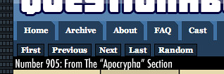 Lastly, there is Questionable Content. This is my all-time favorite web comic, but unfortunately the pagination could do with some work. The text links are really quite small, more so in the context of the rest of the page, with the main menu links right above them and the comic right below. The controls simply don't stand out on the page at all, making them hard to spot and hard to use. There's only about 10 pixels between the pagination links and the main menu links, the serif type does not help for the small text size, and the links are always links even when they shouldn't be. All in all, a lot of improvements could be made to make these pagination controls much more usable.