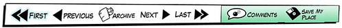 Least I Could Do has some good pagination, where they correctly use the First/Previous and Next/Last setup with large clickable areas and a decent hover state, but the Next and Last links are still links, even if you're on the very last comic; bad UI. Very nice, on the other hand, is the visual distinction between non-pagination related links that are still in the same visual box: Comments and a "Save my place" link, though its purpose eludes me.