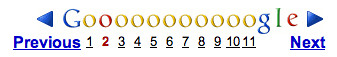 As cute as it is to stretch out the "oo" from "Google" to align with the number of pages, it creates a problem in that the page links are a bit too close for easy selection. Ever tried navigating them by clicking on the o's instead of the numbers? It's not convenient at all. The tenth and eleventh pages make this problem very clear, in particular. Google's Previous and Next links, however, are fantastic — clearly separated and with plenty strong visual contrast with the regular page links. The links unfortunately all have underlines, producing some clutter which, again, makes the double digit page numbers very difficult to distinguish from one another. The clickable areas of the numbers are tiny, and the o's are not easy to use.