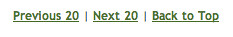 This time, the Previous and Next links aren't much different at all — just a different font-weight — and the page links, albeit larger than their usual search results one, are still just tiny clickable areas that get cluttered the moment they hit double digits. The current page is pretty easily identified, but why on earth is it dropped down? A consistent baseline would have helped (also the case in the first example).