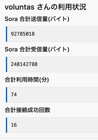 転送量、利用時間、接続成功回数が表示されます。