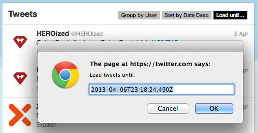 This user script adds “Group by User”, “Sort by Date”, and “Load until...” buttons to the Twitter web app. I'm so tired of Twitter (and Facebook and Google+) not remembering the read state for my posts. My solution in the past was GTweet which allowed me to import my tweets into Google Reader, and Google Reader would happily keep track of all of the tweets I hadn't read yet. I also wrote a user script that added buttons to Reader which allowed me to group/sort the tweets by user to allow me to much more quickly read through them; inpiration for this came from Steve Souders: