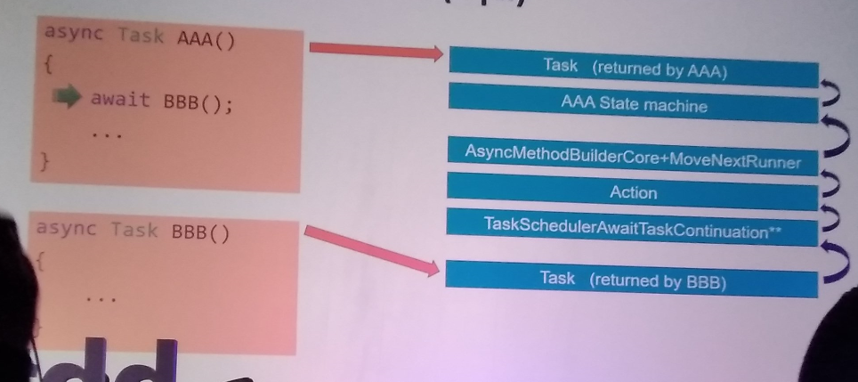 awaitable type must be able to returnGetAwaiter()with the following: implementsINotifyCompletion,bool IsCompleted { get; },TResult GetResult()asyncmeans nothing, it only instructs the compiler to create a state machine- we can make any type awaitable using extension methods