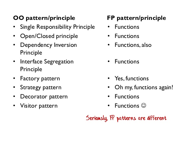 OO makes code understandable by encapsulating moving parts. FP makes code understandable by minimizing moving parts. - Michael Feathers