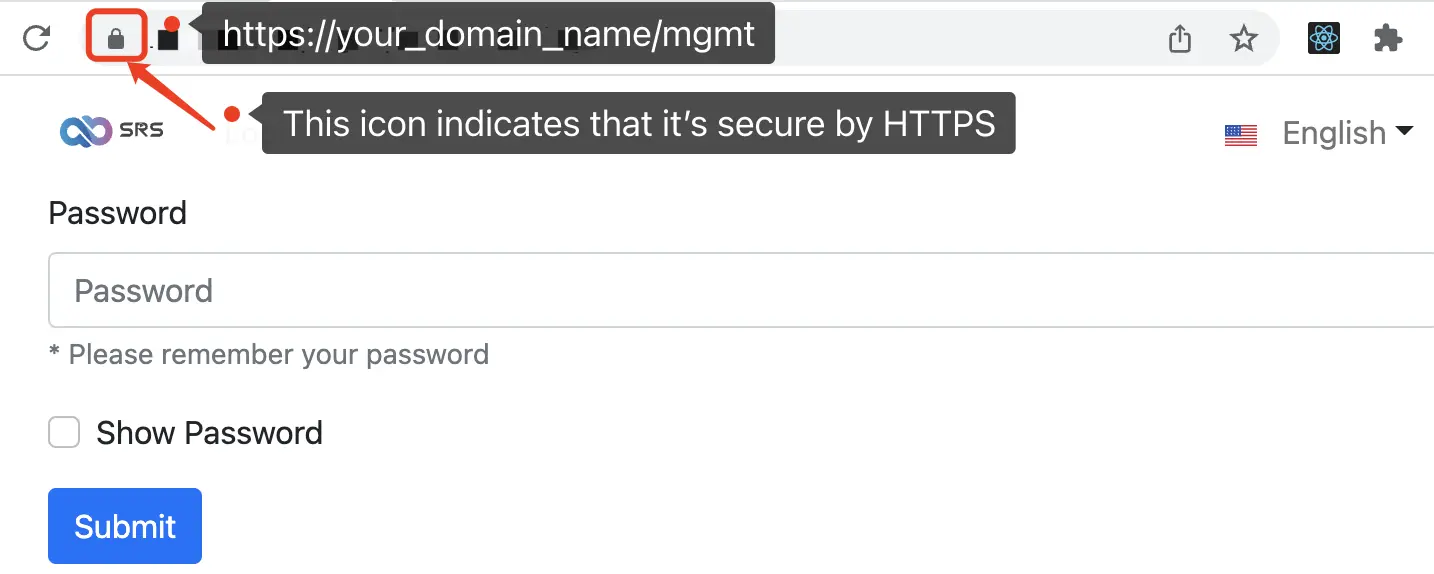 If that's successful, please try reloading your website using https://your_domain_name/mgmt and notice your browser's security indicator, see following figure: