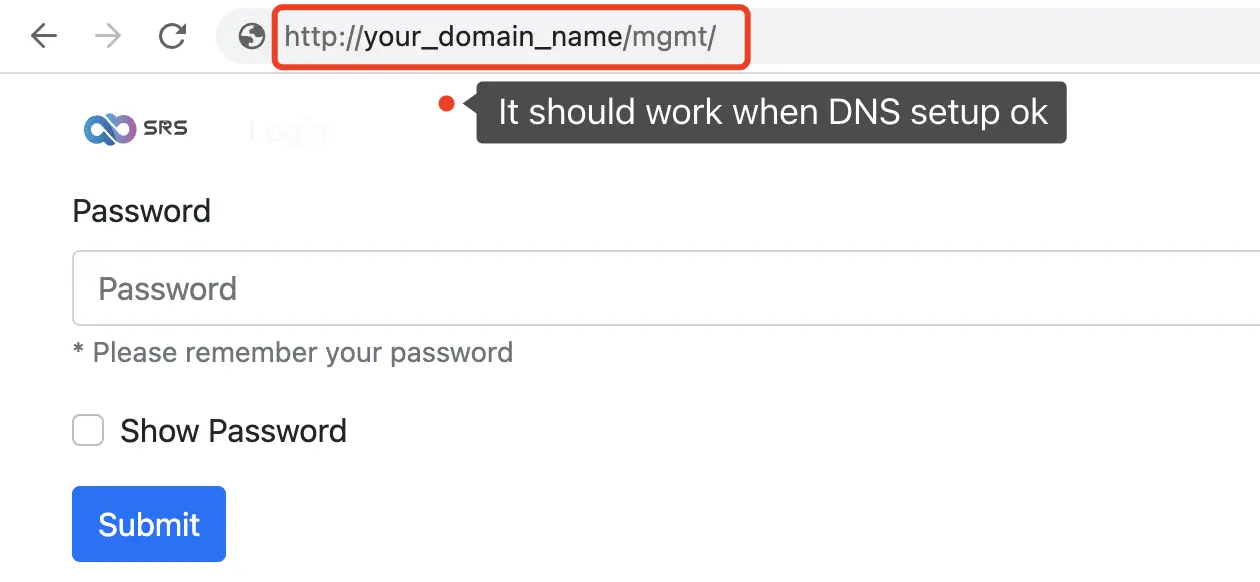 If you visit http://your_domain_name/mgmt, you should see the SRS Cloud console now.