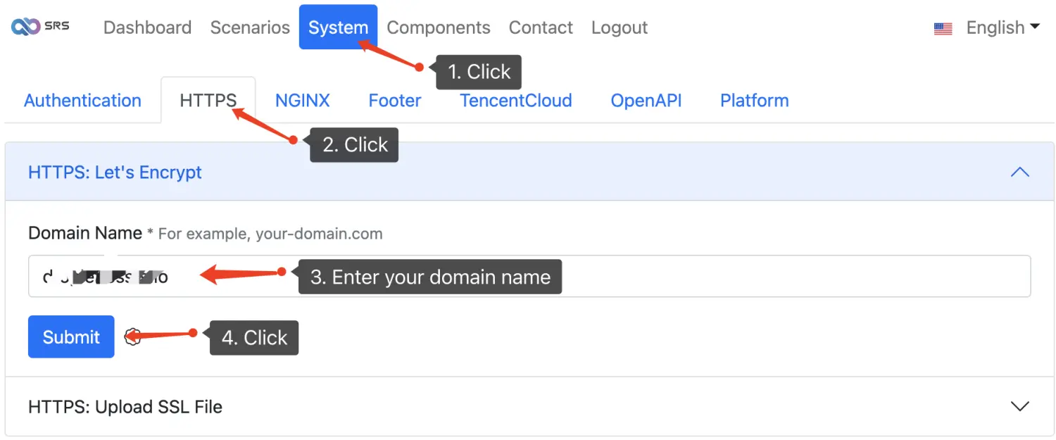 Now please switch to System > HTTPS > Let's Encrypt and enter your_domain_name, then click Submit button to request a free SSL cert from Let's Encrypt: