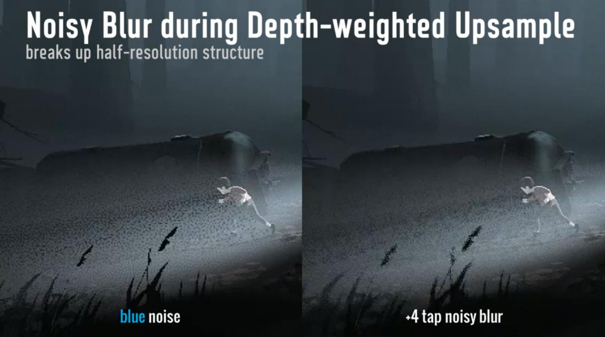 The goal of this technique is to take the texture-output from a half-resolution pass, containing the results of sampling volumetric fog - and scale it up to full resolution. This presents two challenges: