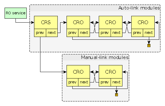 A dynamic module will be added to the tail of one list when loading (as "registering"), depending on whether it is specified to be auto-link; the module will be removed from the linked list (as "unregistering"). RO service (and probably the application as well) uses these two linked lists to iterate among modules when linking.