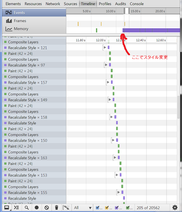 Dev Tools の Timeline タブを見ると、この環境では 1 フレームに 150 回くらい recalculate style してる。