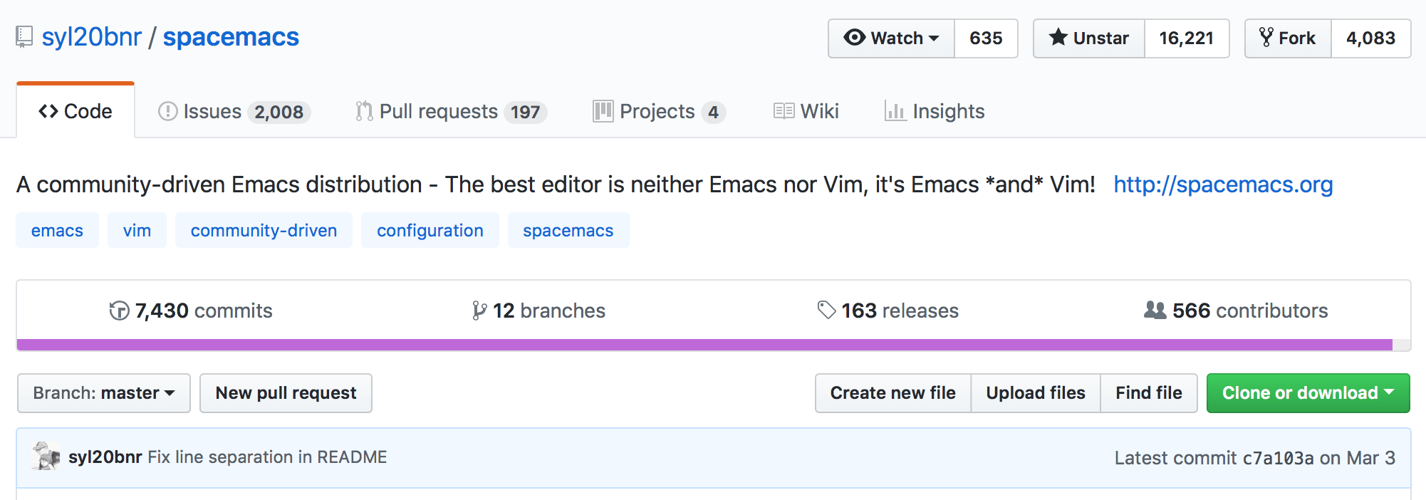 Screenshot taken on Oct. 31, 2018, Spacemacs has 2008 open issues and the last update of master branch is Mar 3, 2018.