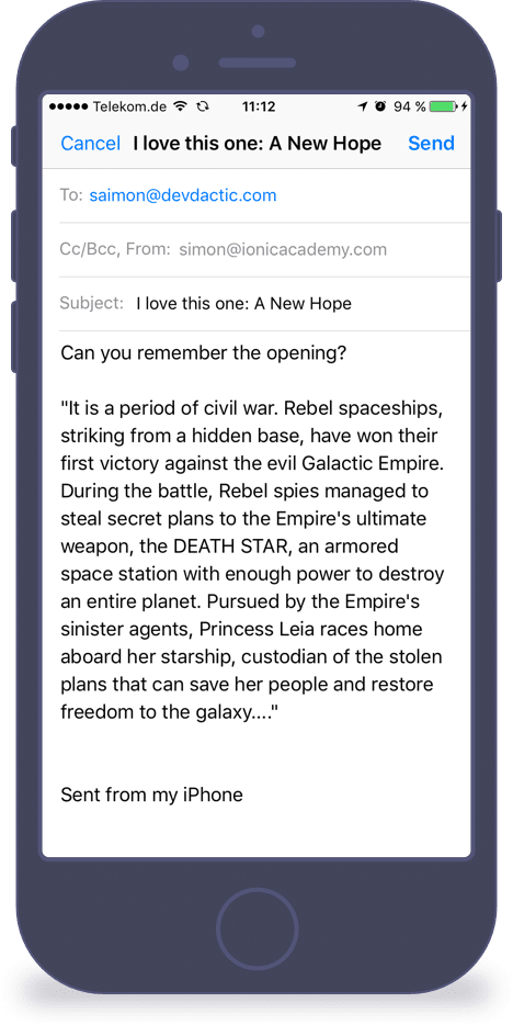 Once you deploy it and use the share function, you will now get to the native email client (in this image for example iOS)!