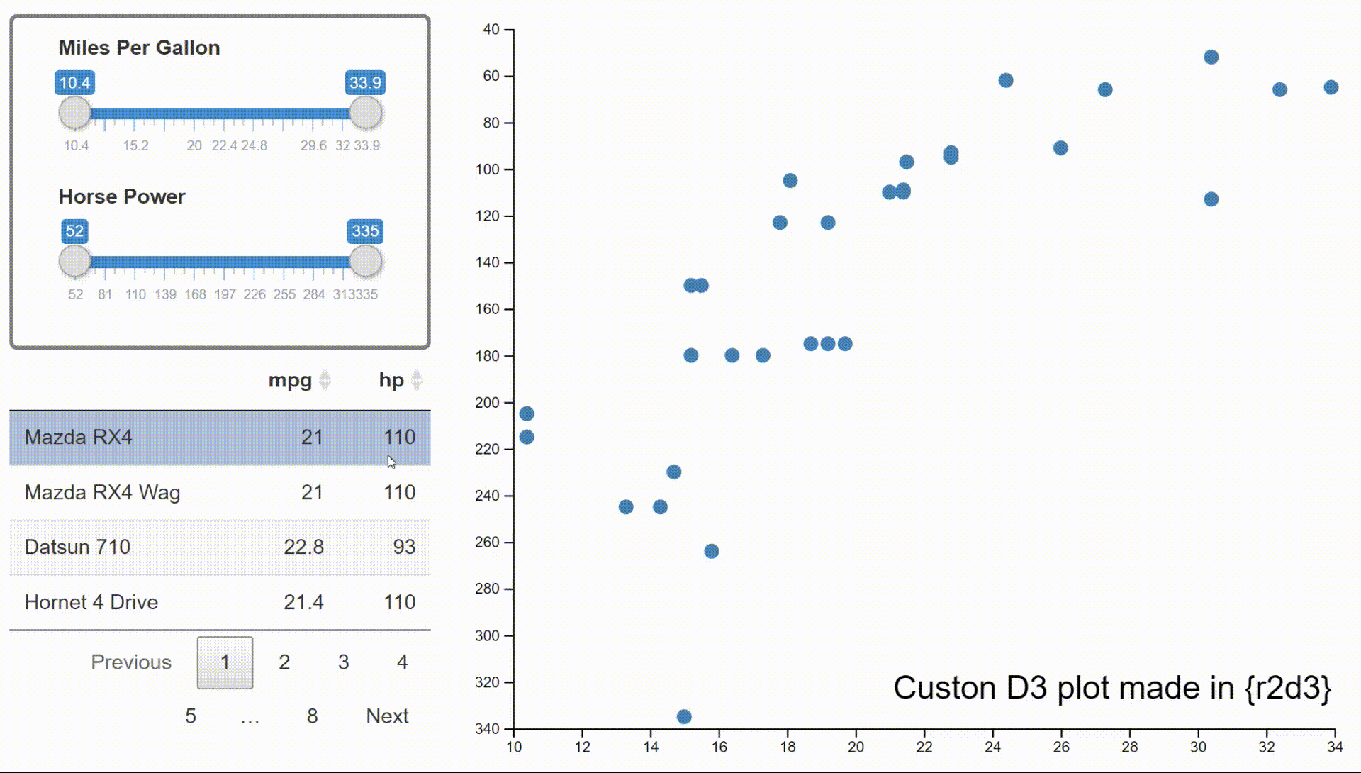 | filter_slider("hp", "Horse Power", mtcars_shared, ~hp) | |