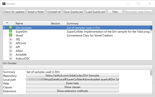 ちなみに、QuarksはSuperColliderのパッケージマネージャ。Quark.guiを実行するとインストール可能なパッケージ一覧が表示されるので、ここからSuperDirtをインストールしてもOK。