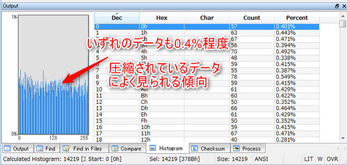 圧縮されたデータの傾向として、頻度解析を行うと0x00~0xffの値はほぼ均一に 0.4%程度(100%/256=0.39%)の割合で出現していることを学んだ。 ただし、0x00~0xffのデータが順番に並ぶような規則性を持つ場合でも ヒストグラム上に同じような傾向が現れるため、頻度解析を行う際には注意が必要である。 ある程度データがランダムに並んでいることを目視で確認したうえで頻度解析を行った方がよい。 (目grepで圧縮データを見た場合、ノイズのような不規則なパターンが見られるケース)