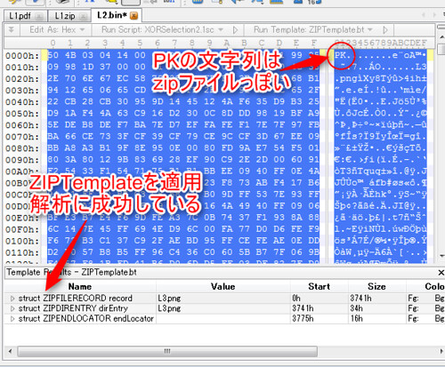 今回の紹介では"PK"の文字列を見つける部分を目視で行っているため、 若干目grepフリーではないツッコミどころも残ってはいるが、 この点に関しては010 Editor用のスクリプトを作成してある程度の自動化で 対応することも可能である。