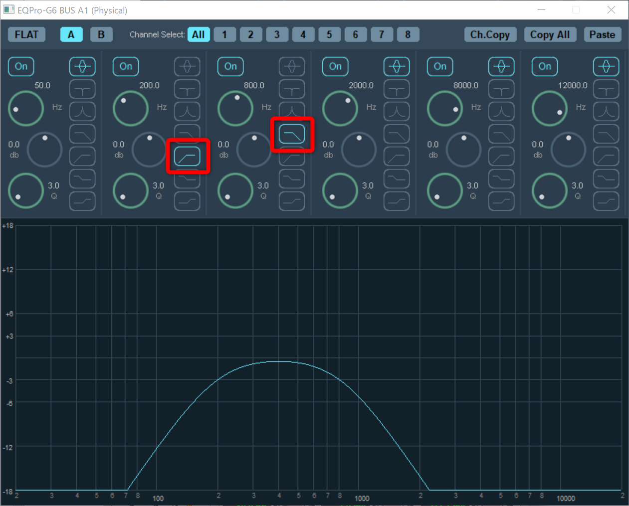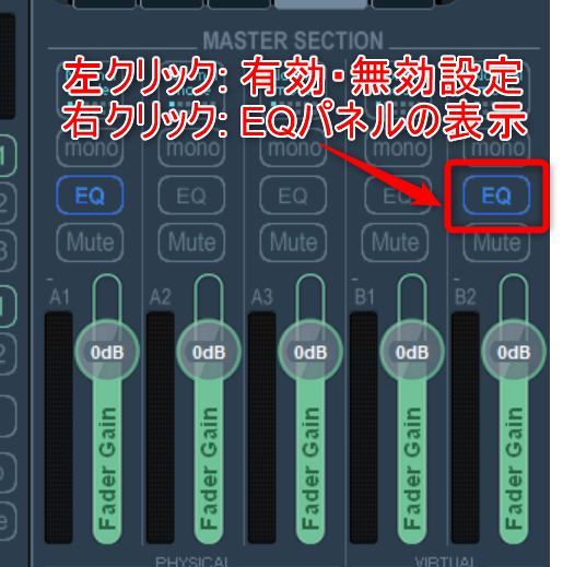 Voice Meeter Banana内蔵のイコライザーを使ってある程度ノイズ軽減を行うことも可能。 出力A1~B2のEQボタンを左クリックすると、その出力に対してイコライザが有効になる。 また、EQボタンを右クリックすると、イコライザ設定ウインドウが表示される。
