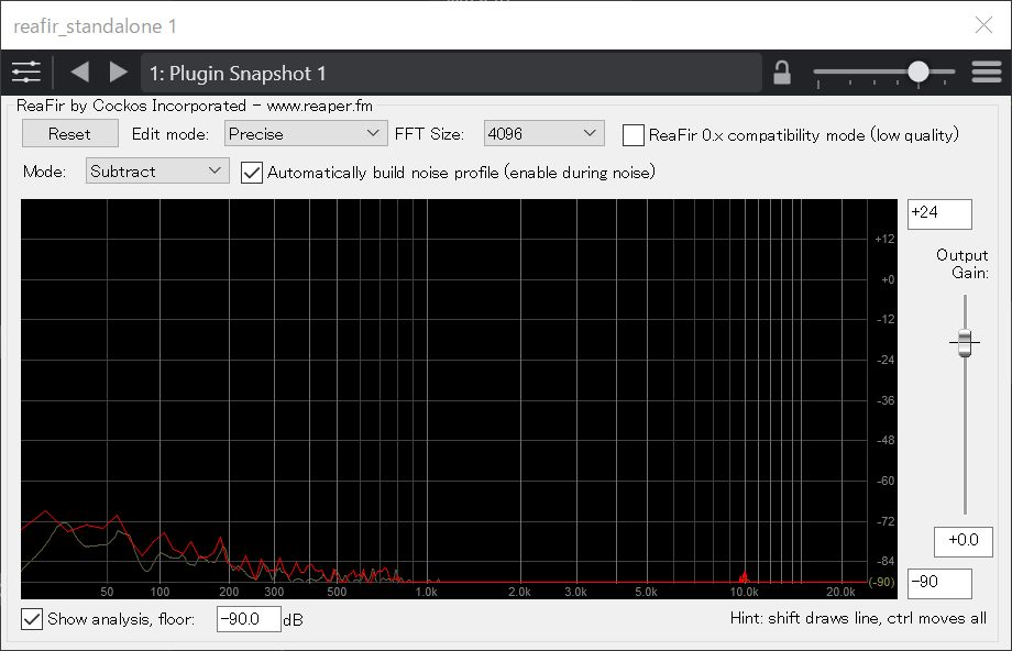 ModeをSubtractに設定し、Automatically build noise profile(enable during nose)を有効にしてしばらく放置する。 しばらくノイズ音声を入力していると、自動的にノイズプロファイルが作成される。(赤い折れ線) だいたいノイズプロファイルが落ち着いたら、Automatically build noise profile(enable during nose)を無効にする。 (ずっとenableにしていると、必要な音までノイズ判定されてしまうので要注意)