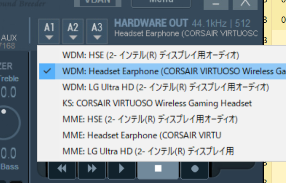 Voice Meeter Bananaのインストール直後や設定リセット直後など、何も設定していない場合は、出力A1の設定を行っておく。画面右上のA1のボタンをクリックすると音声出力デバイスの一覧が表示されるので、この中から実際に音を出力するデバイスを選択する。ASIOやWDMデバイスを選択しておいた方が遅延が少ない。