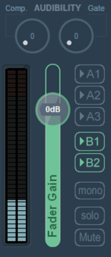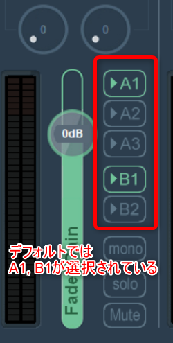 入力のフェーダの右側にあるA1~B2のボタンが出力先の選択。Hardware Input 1の出力先はデフォルトではA1とB1に割り当てられている。 現状でA1は実際に音を出すデバイスに割り当てているため、(1)を設定するとマイク入力の音がそのままスピーカへ出力される状態になる。