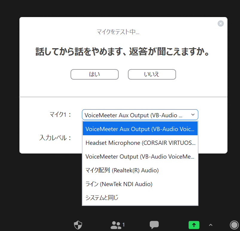 (3) Zoomなどのビデオ会議アプリの音声入力デイバスとしてVoicemeeter AUX Outputを選択すると、Voice Meeter Bananaを通してマイク入力の音を取得できる