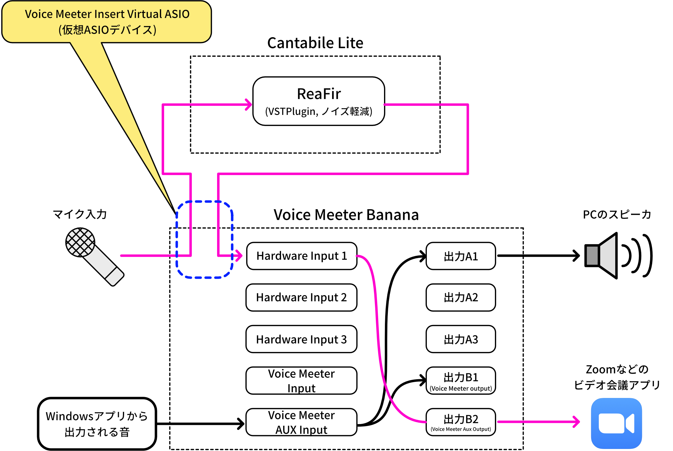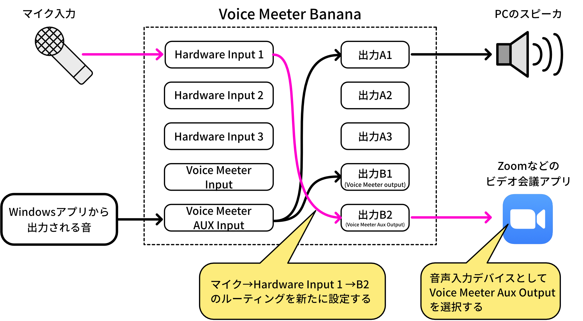 マイク音声をVoice Meeter Bananaで加工してビデオ会議アプリへ入力する場合、次のようにルーティング設定を行う。