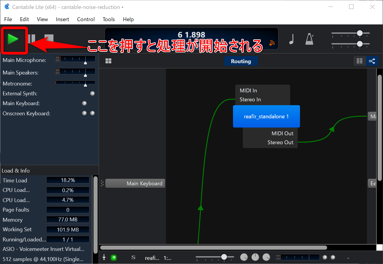 reafir_standaloneのノイズプロファイルが作成された状態で、再生ボタンを押すと、ノイズキャンセリング処理が実行される。