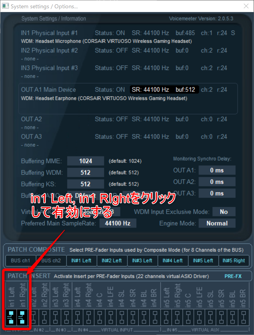 - 設定画面が表示されるので、画面下側のin1 Left, in1 RIghtをクリックして有効にする